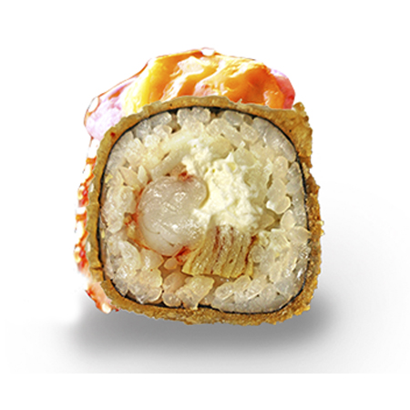 Рис, креветка, сыр Креметте, кляр, панировочные сухари, омлет японский, соус юзу