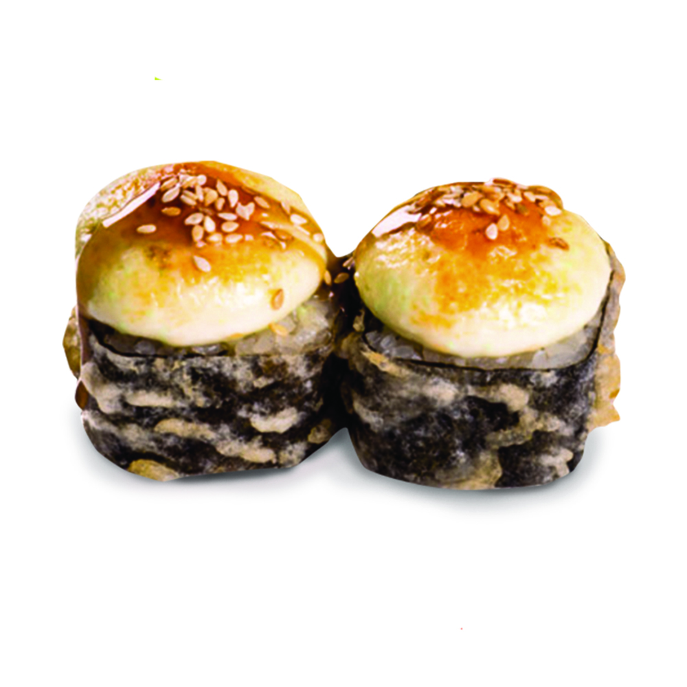 Кальмары жареные в кляре, лосось, помидор, лук зеленый, кунжут, соус чесночный, соус унаги