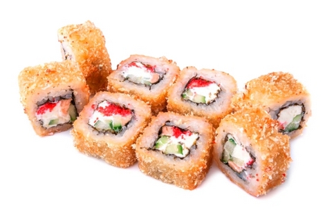 Лосось, огурец, сыр филадельфия, кляр, сухари панировочные, икра тобико