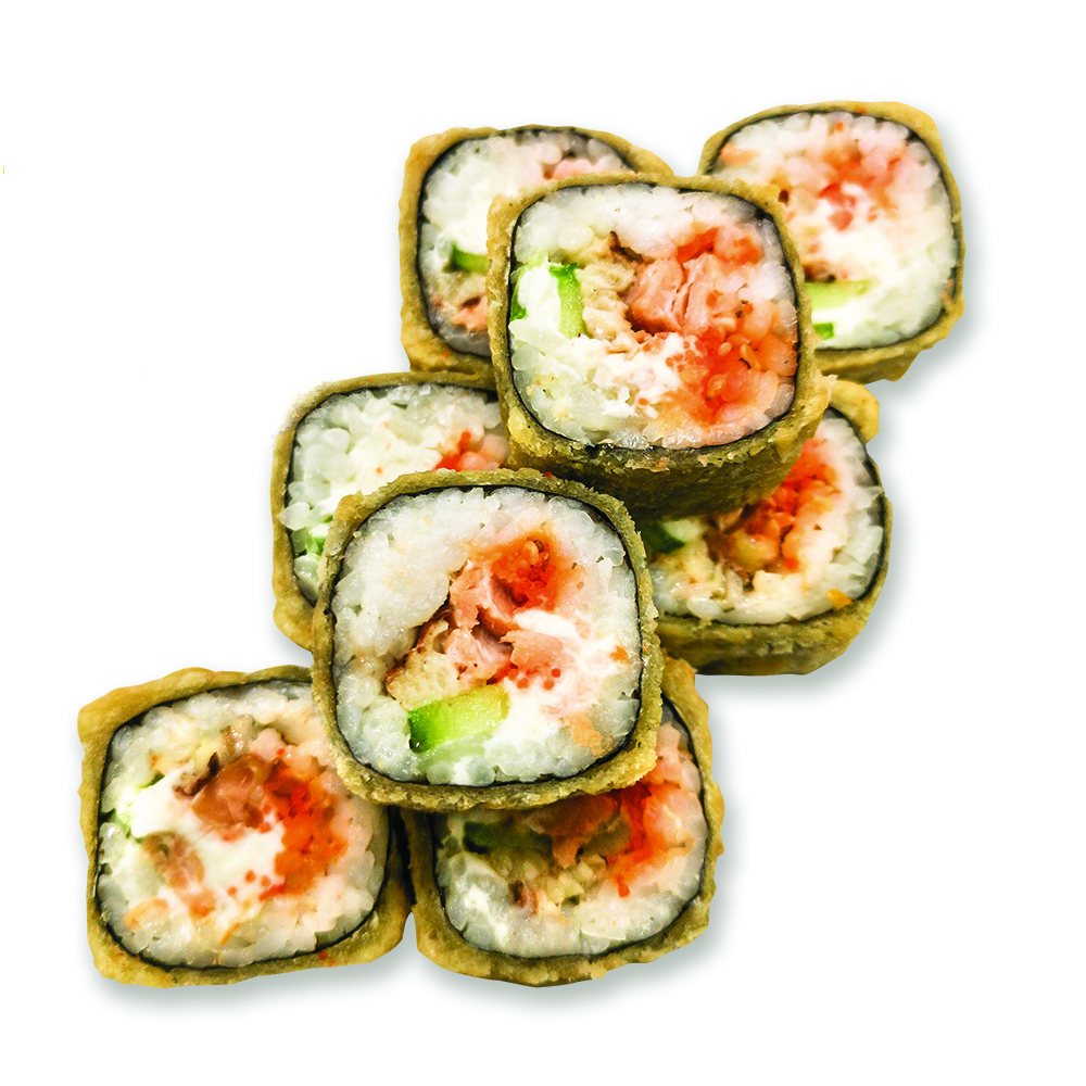 Рис, лосось, сыр Филадельфия, панировочные сухари, кляр, угорь подкопченный, икра тобико, огурец, кунжут белый, соус юзу