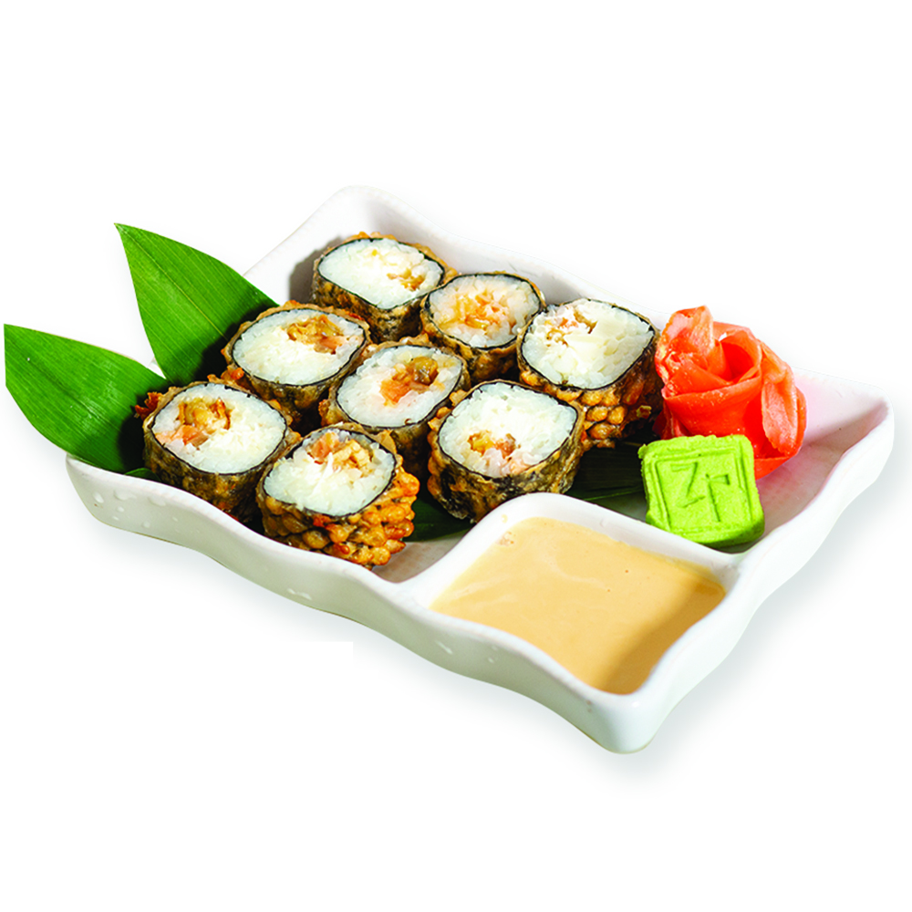 Лосось, копчёный угорь, сыр Филадельфия, кляр, соус юзу. Энергетическая ценность: 378 ккал