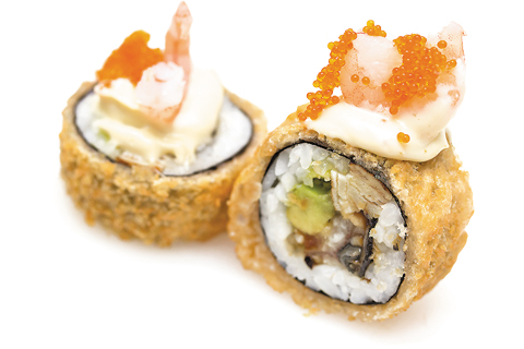 Угорь, коктейльная креветка, икра тобико, омлет, авокадо, сладкий соус васаби, кляр, темпурная мука, соус юзу. Энергетическая ценность: 630 ккал