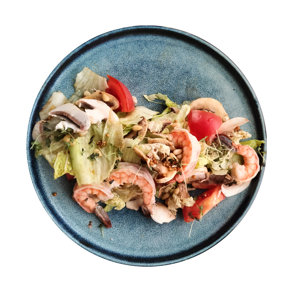 Креветка, шампиньоны, микро зелень, томат черри, чеснок, кедровые орехи, бальзамический уксус, соевый соус.