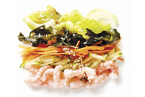 Креветка, огурец, морковь, водоросли вакаме, салат айсберг, саке, кунжут белый, цитрусовый соус (апельсин, понзу лимонный, мирин). Энергетическая ценность: 287 ккал