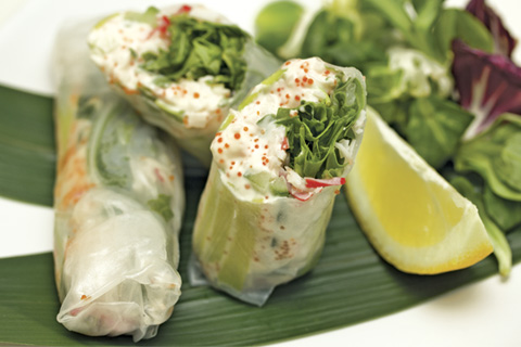 Икра тобико оранжевая, авокадо, огурец, руккола, рисовый блинчик, японский майонез. Энергетическая ценность: 259 ккал