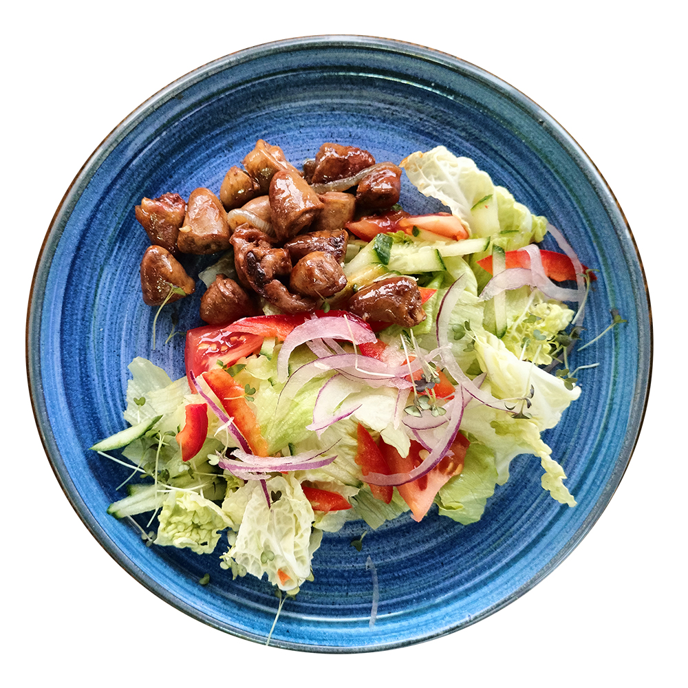 Сердечки куриные, лук репчатый, капуста китайская, салат листовой, огурец, перец болгарский, лук фиолетовый.