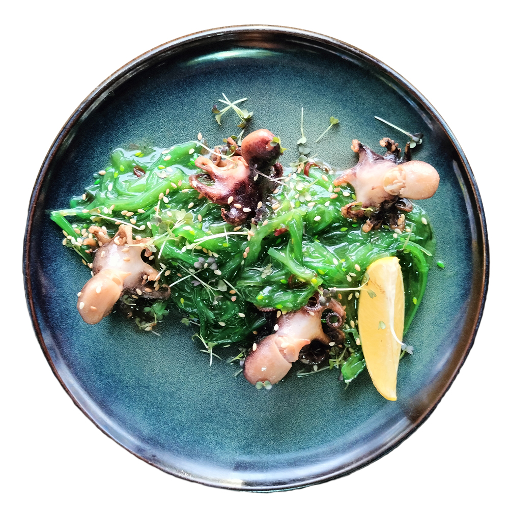 Бэби-осьминожки с соусом терияки, маринованные водоросли, томаты черри. Энергетическая ценность: 121 ккал