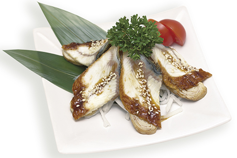Угорь подкопчёный, японский омлет, лист салата, дайкон, кунжут, соус унаги. Энергетическая ценность: 348 ккал