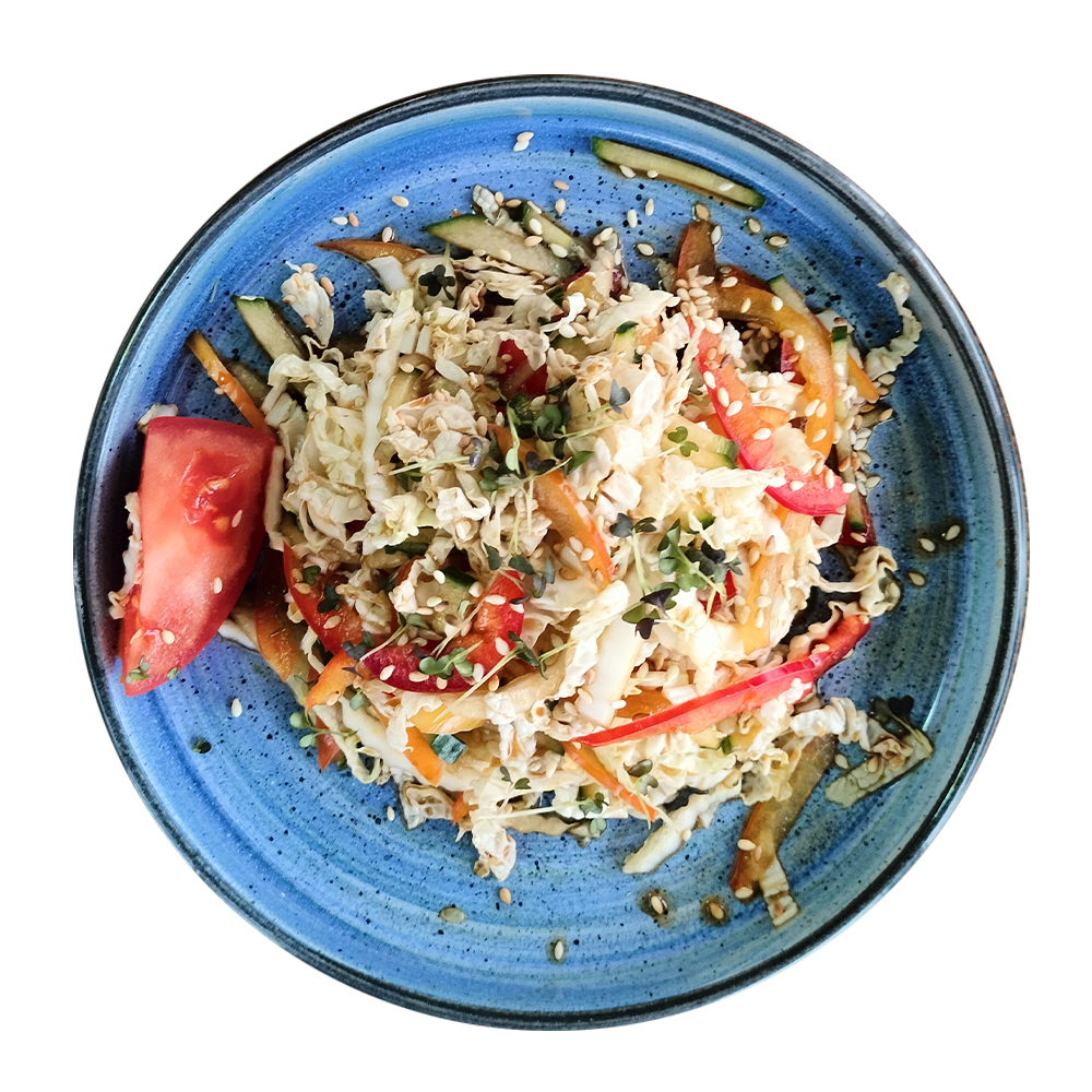 Огурец, болгарский перец, китайская капуста, помидоры черри, соус гёдза. Энергетическая ценность: 70 ккал