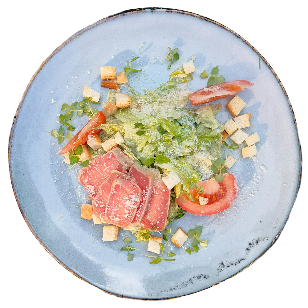 Филе курицы или тунец, лист салата, гренки, сыр пармезан, помидоры черри, соус спайси. Энергетическая ценность: 499 ккал