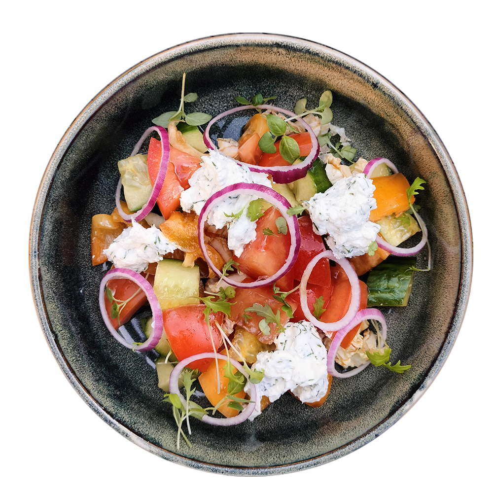 Огурец, болгарский перец, китайская капуста, помидоры черри, маслины, лук фиолетовый, зеленый, сыр Филадельфия с зеленью, фирменный соус