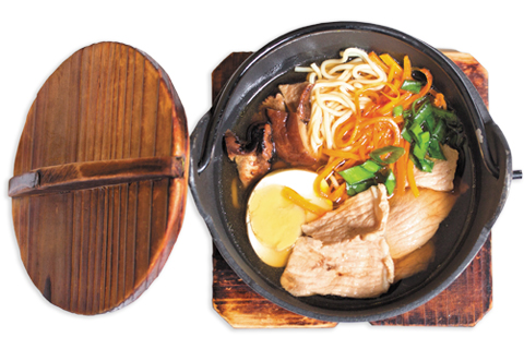 Свиная вырезка, яйцо, грибы шиитаке, лапша рамен, морковь, зелень. Энергетическая ценность: 311 ккал