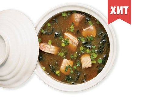 Лосось, бульон суимоно, водоросли вакаме, грибы шиитаке, сыр тофу, кунжут. Энергетическая ценность: 193 ккал