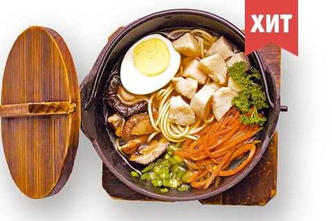 Куриные брусочки, лапша рамен, грибы шиитаке, морковь, яйцо, зелень. Энергетическая ценность: 381 ккал