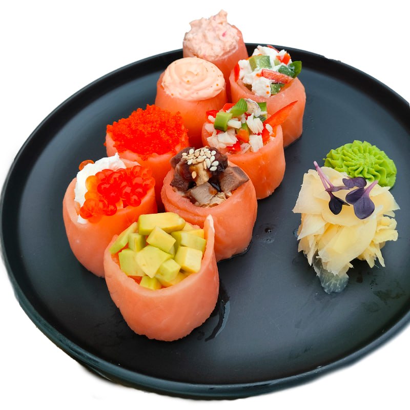 Суши Делюкс (8шт): Икура Делюкс, Тобико Делюкс, Тануки Делюкс, Фета Делюкс, Кани Делюкс, Авокадо Делюкс, Фудзи Делюкс, Унаги Делюкс