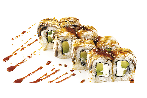 Угорь, авокадо, сыр Филадельфия, кунжут, соус унаги. Энергетическая ценность: 480 ккал