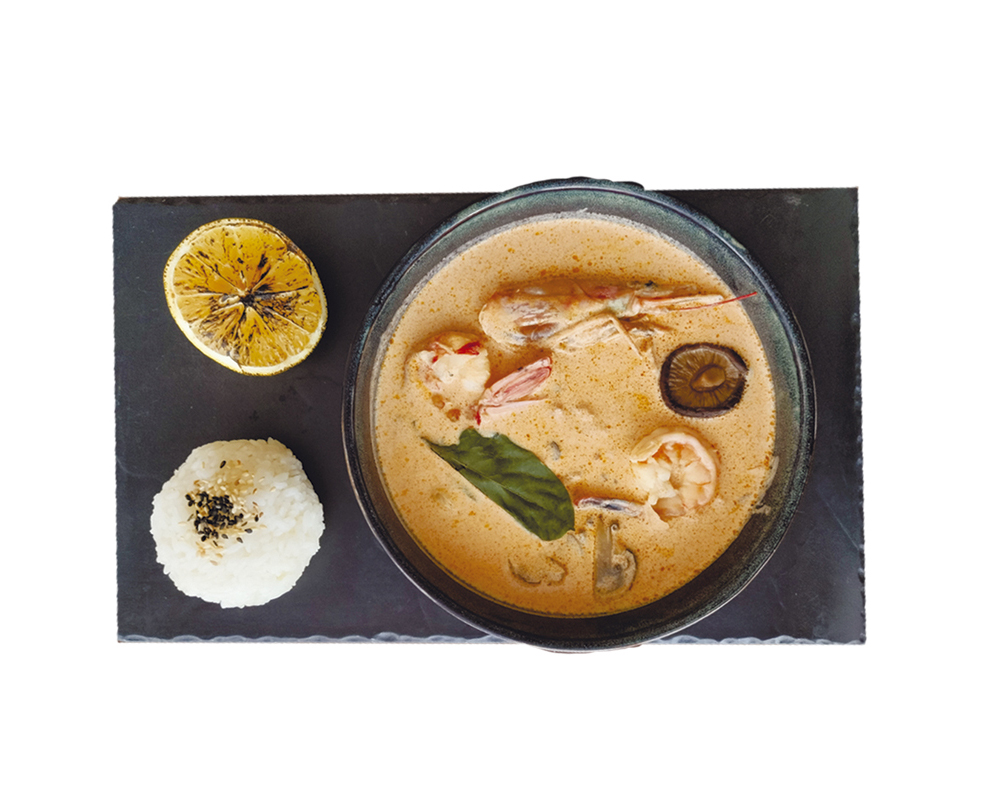 Креветки, сливки, кокосовое молоко, грибы шиитаке, рис гохан, специи, зелень. Энергетическая ценность: 677 ккал