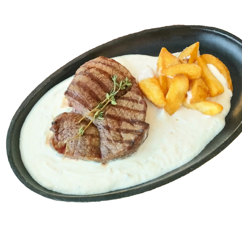 мраморная говядина в сливочно-перечном обжаренная на гриле, картофельные дольки